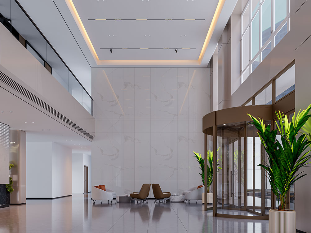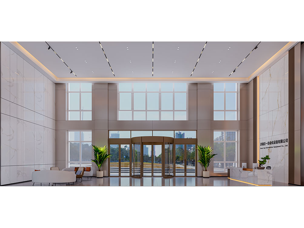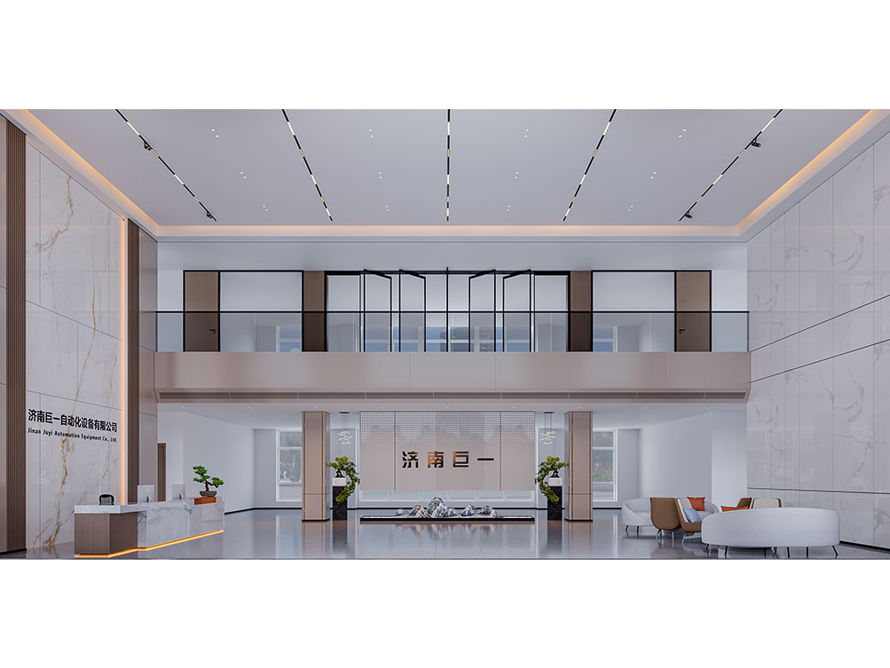設(shè)計(jì)理念: 作為濟(jì)南辦公室裝修中企業(yè)形象型空間的代表,巨一自動(dòng)化大堂以大理石飾面 + 金屬線條打造輕奢質(zhì)感:挑高空間搭配嵌入式燈光,強(qiáng)化大氣氛圍;弧形旋轉(zhuǎn)門(mén)與綠植點(diǎn)綴柔化冷硬,前臺(tái)與品牌墻的一體化設(shè)計(jì)精準(zhǔn)傳遞企業(yè)形象,契合濟(jì)南辦公室裝修商務(wù)展示接待功能的核心需求,是濟(jì)南工業(yè)企業(yè)辦公空間的高端范本。